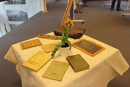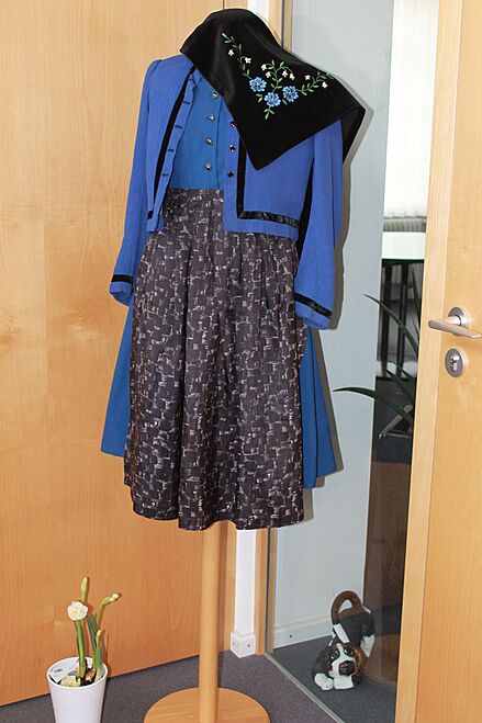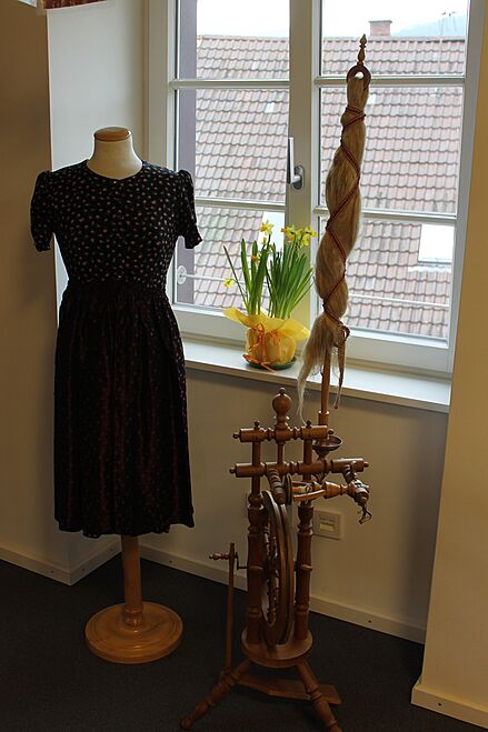 Bauernkleidung und Lehrbücher in Sütterlinschrift an die alte Zeit.