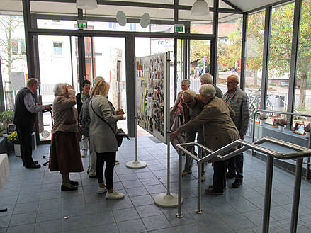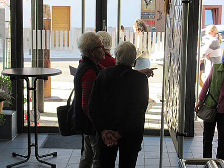 Galerie“, vor der Gemeindehalle und schließlich in der Halle selbst aufgestellt